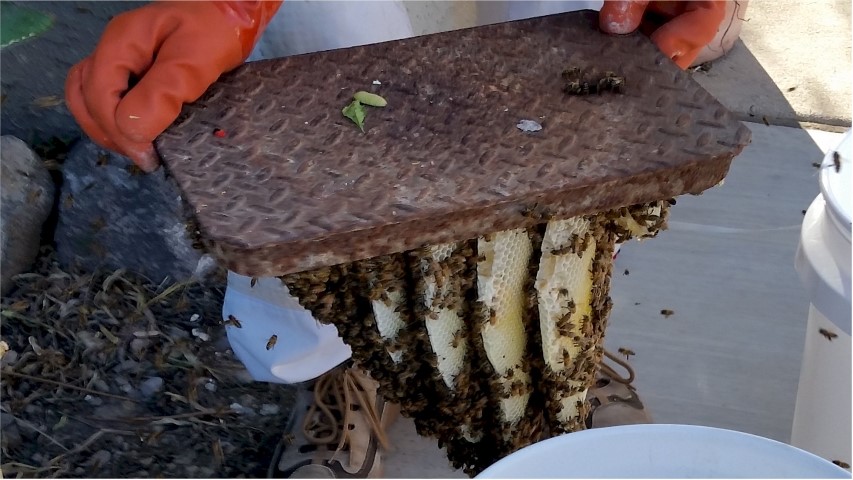 Removal: Once we agree on the services to be rendered which may range from a simple clipping of a branch to remove a recent swarm to removing an established hive from a location that requires much more effort to access, then we get to work. Even without established comb, swarms that have a larger size or are located on a building, or in the crook of several branches on a tree can take 2 or more hours to remove. More challenging removals generally take 3-5 hours and depending on the location and size of the hive even longer. During removal of a hive with comb, we generally need to cut out or disassemble the area they have colonized in order to remove all comb (a VERY important step). As we remove them we take care to identify comb with nectar and honey stores (the bees food storage), and brood (eggs, larvae, and baby bees). We seperate the comb and either place it into frames for a bee hive, or prepare it for transport and do the framing work off-site which can add an hour or more time. We clean and treat the area with a natural bee repellent. We then repair and seal the area. We also exclude the original entry point or points. Every situation is different.