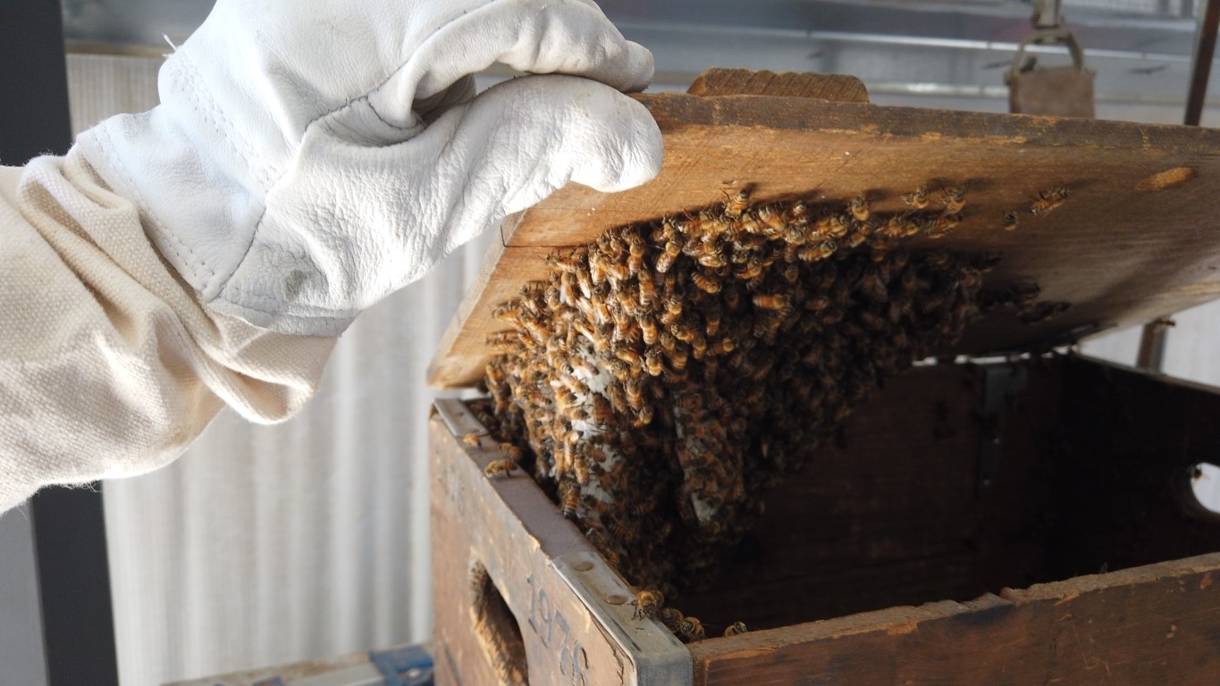 stores into wooden frames one by one to place into the new hive box. The rest of the colony is then reunited with the comb, or placed into a freshly