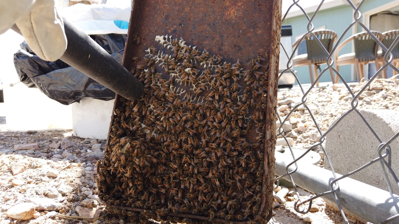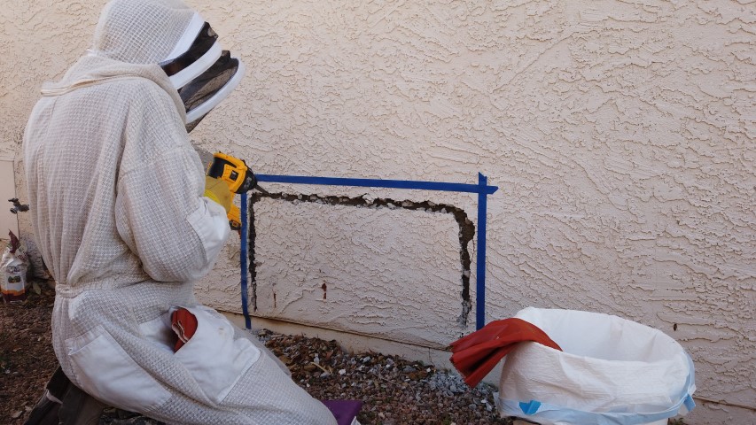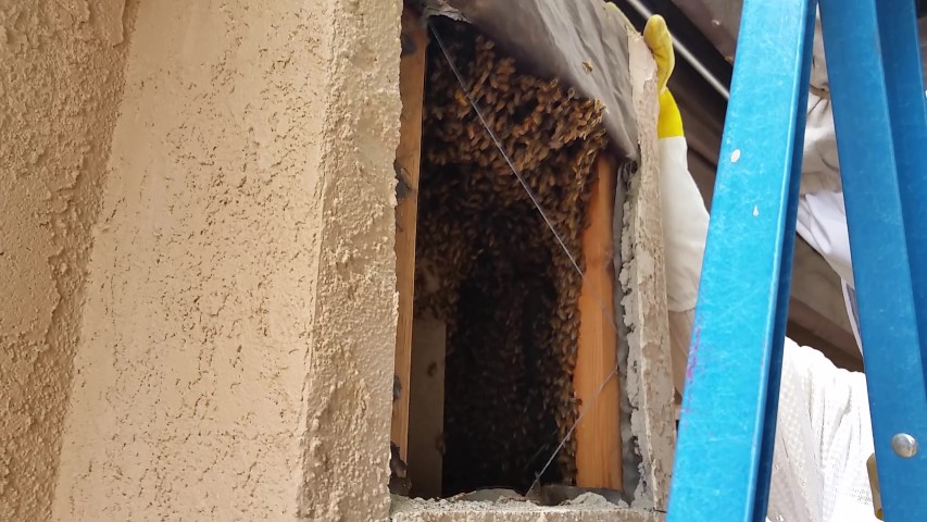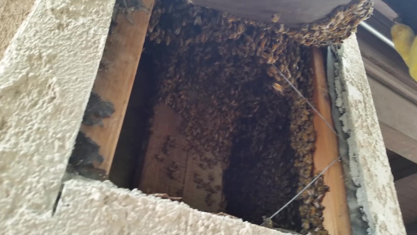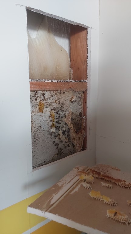 Structural removal requires a cut-out or opening of the structure, removal of the bees, removal of as much comb as possible (an important step to avoid may other problems in the future), cleaning and treating the area with a natural bee repellent, in most cases provide repair of the area and finally we perform an exclusion of the original point or points of entry so you will not have problems in that same space again. Please call to discuss your situation or text pictures.