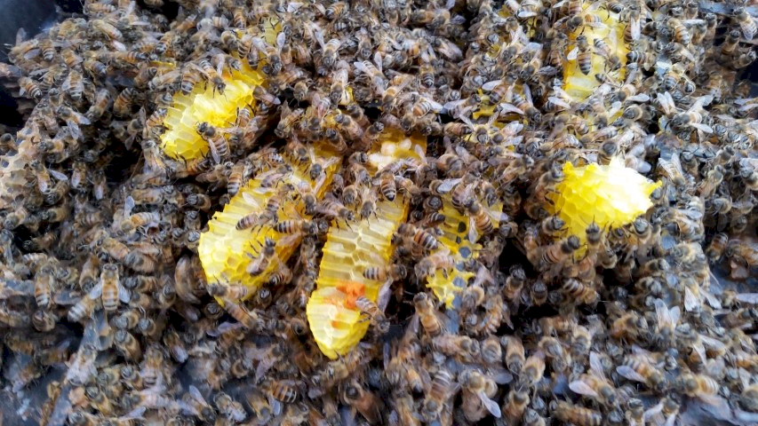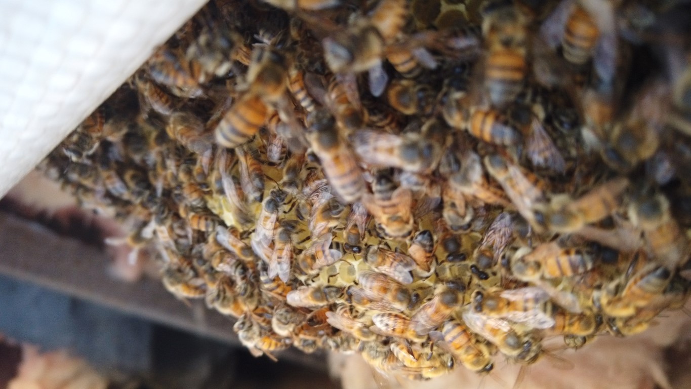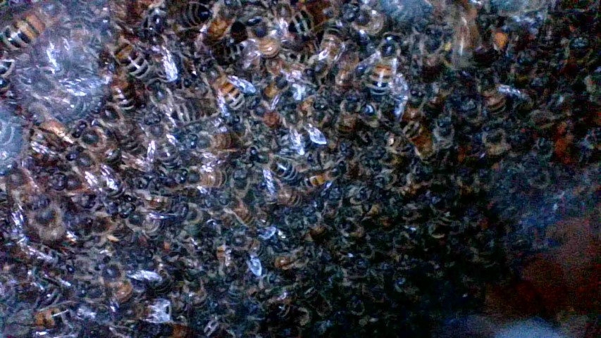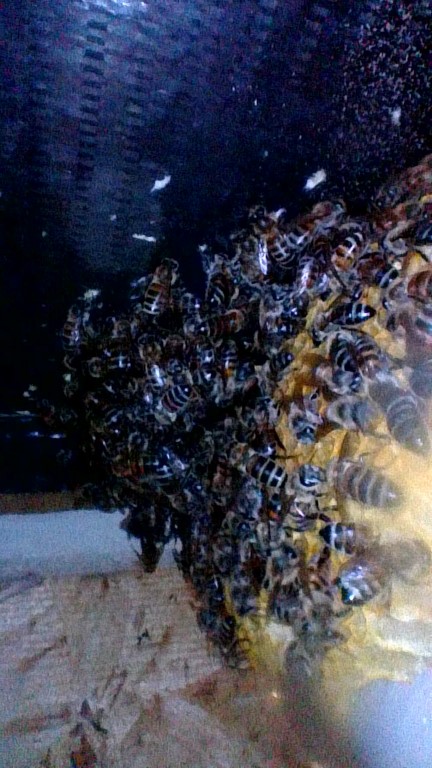 of thousands (often tens of thousands) moving in between multiple layers of wax comb and protected by the comb, the structure, and each other. The queen can lay over 1000